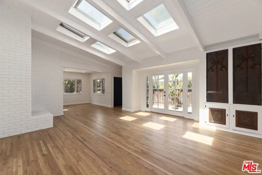 Fantastic Laurel Canyon mid-century ranch home with an in-ground pool/spa and ample outdoor entertaining areas. This former celebrity home is filled with light and freshly remodeled while retaining some eclectic canyon vibes. The living room features vaulted ceilings with skylights, wood floors, French doors, and a gas fireplace. The kitchen opens to a bright dining area and is outfitted with new appliances, quartzite countertops, and tile walls. A back hall provides direct entry to the garage, a walk-in pantry, and laundry area. Access the pool and spa directly from the primary bedroom, or enjoy the soaking tub in the luxurious en-suite bathroom. The second bedroom also has outdoor access and is adjacent to a hallway bathroom. The den/study includes an additional bathroom and has direct access to a private patio area. Outside, the gated courtyard and brick patio areas offer options for al fresco dining under the sky, lounging by the pool, or relaxing in the spa. Nestled in the trees above the street on a large corner lot in the Hollywood Hills, this home is well located in the Wonderland School District with easy access to the Sunset Strip and the Valley.