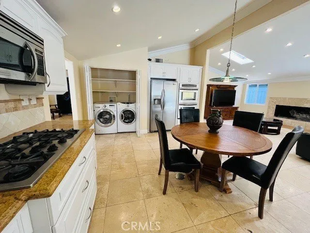 The large chef’s kitchen seamlessly opens to the family room and dining area, creating an inviting open-concept layout. Multiple sets of French doors extend your living space outdoors, perfect for California indoor-outdoor living.