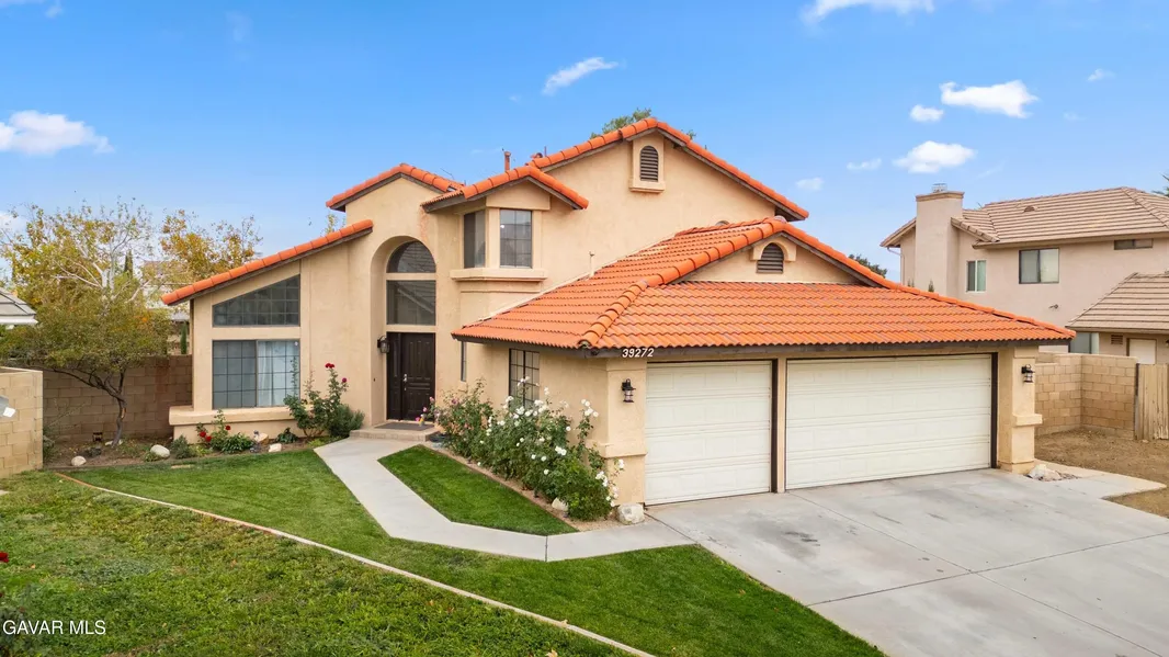 Centrally located in West Palmdale's desirable Rancho Vista community, this light-filled 4BD/3BA home offers 1,983 sq ft on a generous 8,723 sq ft lot at the end of a quiet cul-de-sac with no through traffic. Commuters will love the quick access to the 14 Freeway, while shopping, dining, parks, and everyday essentials are just minutes away. Soaring ceilings, abundant natural light, and new tile flooring downstairs create a bright, open feel. The floor plan features formal living and dining rooms plus a cozy family room with fireplace and backyard views. The kitchen has plenty of cabinet space and an easy flow for cooking and entertaining. A full bedroom and full bathroom downstairs are ideal for guests, multigenerational living, or a private home office, with an indoor laundry area nearby. Upstairs, two secondary bedrooms share a Jack-and-Jill bathroom, and the spacious primary suite includes a walk-in closet, dual vanities, and en-suite bath. The backyard offers a great usable space with a spa, room to relax or play, and side yards on both sides of the home. A three-car garage and ample driveway parking provide plenty of space for vehicles and storage. Located in a quiet, safe neighborhood within the sought-after Westside school area, this home is convenient to Summerwind Elementary, David G. Millen Magnet Academy (law/government and STEM focus), and Highland High School (AP and college-prep programs; buyer to verify). All three schools are within roughly a mile or less of the property, making school drop-offs and after-school activities incredibly convenient. No Mello Roos or HOA!