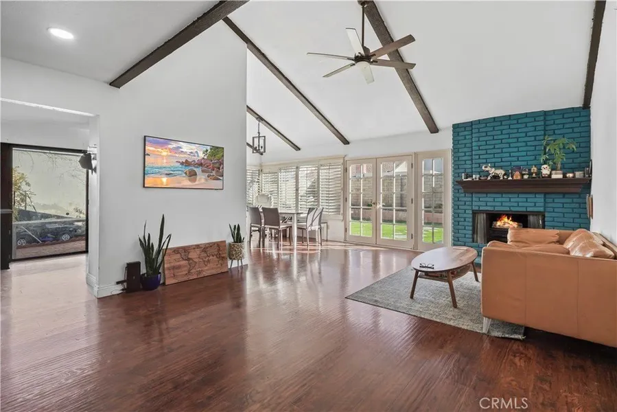 Welcome to this charming single-story 2 bedroom, 2 bathroom home perfectly situated on a cul-de-sac in Valencia’s highly sought after Old Orchard II neighborhood. This light-filled residence features an open concept floor plan with beamed ceilings in the living room and a cozy brick fireplace with a wood mantle. The dining area and kitchen, which boasts garden windows overlooking the backyard, provide abundant natural light. The primary bedroom is spacious with mirrored wardrobe doors, while the flexible second bedroom features beautiful French doors. Enjoy your own private backyard retreat featuring newly installed, low-maintenance turf and mature fruit trees - lemon, peach, and fig - creating a serene space perfect for relaxing or entertaining in any season. This home offers exceptional value with a 2-car attached garage, LEASED SOLAR PANELS (18) for significant utility savings (buyer to assume lease), and best of all, NO MELLO-ROOS! Enjoy an incredibly LOW HOA of just $76/MONTH that includes access to the clubhouse, sparkling pool, sports courts, and access to Valencia's famous paseos. Located within walking distance to award-winning schools, parks, and the Valencia Town Center, this property offers the ultimate combination of comfort, convenience, and low-cost living.