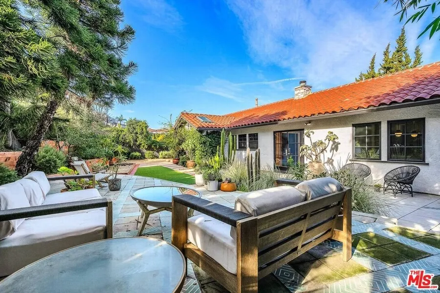 Updated Spanish hacienda style home in Baldwin Hills is perfect for entertaining with large open concept areas and indoor-outdoor flow from the entrance courtyard, through living and dining and out through the French doors to lusciously landscaped rear yard retreat area. There is a Meyer lemon tree, a passionfruit vine, an apple tree, blueberry bushes in the front, a peach tree, a kumquat tree and a baby pomegranate tree among the foliage. Wide plank wood floors throughout the living spaces, new double paned windows, new doors, security system, light and bright feel throughout the home and privacy! It's truly a Shangri-La! Top of the line Chef's kitchen features a large island with quartz countertops and breakfast bar seating comfortably for 4, double farmhouse sink, high quality custom cabinetry and high end finishes. Full laundry room and 3/4 guest bathroom off the kitchen hall. Primary suite features large ensuite bathroom with dual vanity, large shower, WC and walk-in closet. Two additional bedrooms with shared hallway bathroom. Plus a great bonus space off the dining area that could be used as a 4th bedroom, office or den. Two car garage with EV charger and direct access to kitchen hall. Rooftop deck over the garage has view of the Hollywood sign accessible from stairs in the entry courtyard. Property is fenced and fully enclosed.