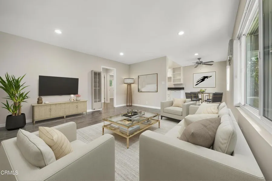 OPEN HOUSE Saturday January 17 at 1:30 PM! Remodeled Spacious Two-Bedroom Top floor unit residence with Gated Parking in Unit Laundry hook-ups and Large Balcony with privacy screen. This spacious home has an abundance of large newer windows that fill the home with bright natural light. A large second bedroom offers an excellent FLEXIBLE SPACE for a home office or gym! A tastefully updated kitchen features a new stove/oven, quartz countertops, new faucet, Dishwasher, microwave, and garbage disposal. Some other nice attributes of the home include a large balcony, balcony privacy shade, premium laminate flooring throughout, smooth ceilings, recessed LED lighting with dimmers, newer dual pane energy saving windows, custom blinds and updated bathroom. This lovely residence is equipped with AC, IN UNIT LAUNDRY hook-ups, USB charging outlets in the bedroom/den and is cable primed. The bathroom updates include a new medicine cabinet vanity with mirrored interior, newly installed handheld shower head, soaking bathtub, and ceiling fan/heater. The bedrooms have beautiful designer beveled mirror closet doors and a custom-organizer storage system. Included in the rent are TWO assigned Gated Parking spaces with remote-controlled entry and a large storage cabinet. An optional extra clean on-site laundry room has an easy phone pay application. This home is in close proximity to the metro/freeway, South Lake, Old Town Pasadena shopping and Chic restaurant dining. Great Pet-Friendly Community! Living room has been staged.