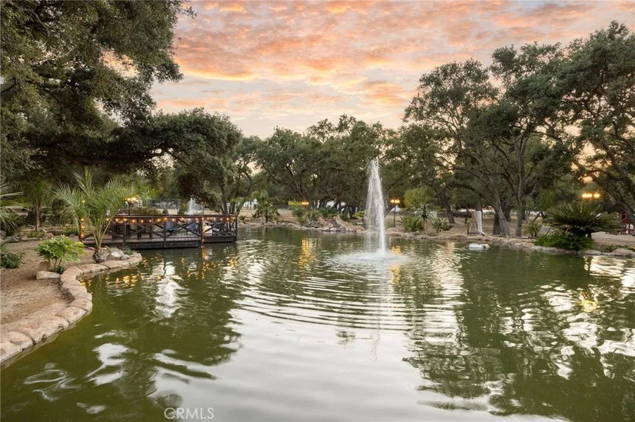 Behind a grand, gated entrance lies one of Sand Canyon’s most spectacular hidden gems—an extraordinary Spanish Mediterranean estate set on 6.27 oak-studded acres across two legal parcels, each with its own private gated access. Offering the perfect blend of luxury, privacy, and versatility, this property is ideal as a private retreat, family compound, or event-ready estate. The 6,350 sq ft main residence features 5 bedrooms, all with en-suite bathrooms, and 7 bathrooms total, including one bedroom conveniently located on the main level. Designed for both entertaining and everyday living, the home boasts soaring ceilings, expansive balconies, a private gym, theater room, and full bar. The primary suite occupies the entire west wing upstairs, complete with a spa-like bathroom and an oversized balcony overlooking the lake, while the junior primary suite mirrors this design on the east wing, offering its own private balcony and exceptional privacy. A 1,856 sq ft detached guest house provides outstanding separation and flexibility. The two-story structure includes a large open downstairs space—previously used as a recording studio—with a powder room, and an upstairs bedroom, full bathroom, and additional living area. At the heart of the property is a stunning private lake with waterfall and pier, surrounded by majestic oak trees, creating a setting that feels both serene and unforgettable. The grounds are further enhanced by a barn, riding arena, chicken coop, and aviary, making this a dream property for equestrian enthusiasts, hobby farmers, or those seeking a true estate lifestyle.