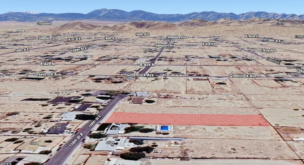 Research Parcel InformationFrom Avenue O, head north on 170th St E. Continue for approximately 1 mile, then turn right (east) onto E Avenue N-8. Follow E Avenue N-8 toward the surrounding neighborhood. Use APN 3169-004-012 for GPS reference, as the parcel does not yet have an assigned street address. Rural desert area road signs and markers may be limited. Recommend using satellite view to locate exact parcel boundary