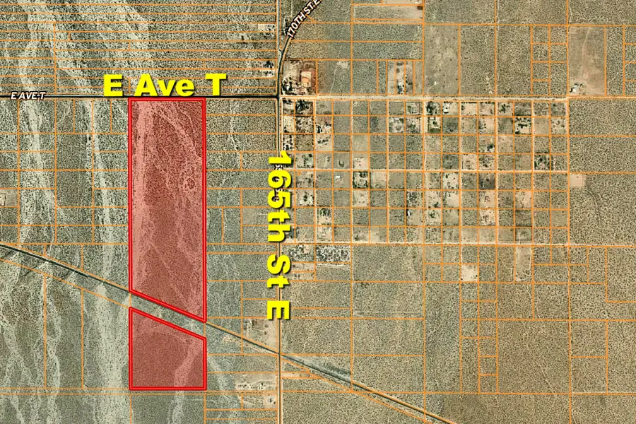 Driving Directions: From Hwy 138 east of Palmdale, turn north on 96th St E. Turn right on E Ave T. Parcel is on the right. It starts approximately 1320 ft west of 165th St E. Acreage is mostly north of the canal and partially south of the canal. Take the aerial map.