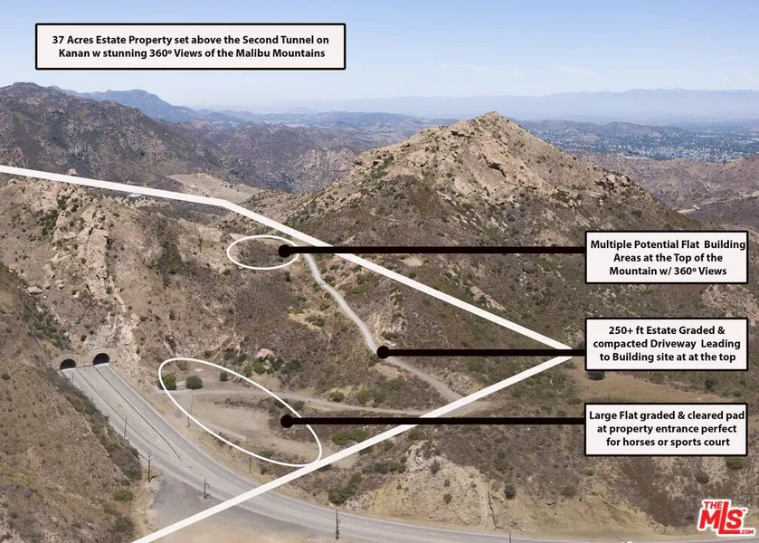 See Video Tour for 360 Virtual Tour of Property & Aerial Video. One of the last Estate setting properties in the Malibu Mountains in the heart of the "Malibu Wine Country" with stunning 360 degree views at the top of the mountain overlooking the vineyards, rolling hills, Mountains and Valley set above the second tunnel on Kanan Dume Road. This 37 acre property has multiple potential building sites at the top of the 250+ ft graded/compacted driveway and a large flat pad at the entrance to the property perfect for horses or sports court. LA County has given preliminary approval for an over 10,000 sq ft Estate. Tremendous opportunity to make a one of a kind mountain top Estate. Property is only 5 miles to the ocean or the 101 Freeway.