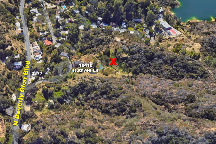 Driving Directions: The lot is behind the house at 10410 Ruthven Ln in the Bel Air neighborhood of Los Angeles. Do not drive up the private driveway for 10410 or disturb neighbors. Take the aerial map.