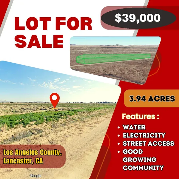 Elevate your living experience with this extraordinary 3.94-acre lot, a hidden gem in Los Angeles County, Lancaster, CA, priced attractively at $39,000. Beyond its impressive size and cost, this property offers a tapestry of features that seamlessly blend nature's beauty with urban convenience.