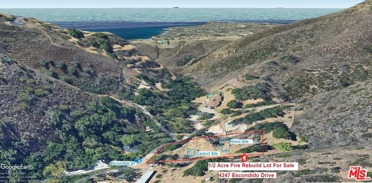 1/2 Acre /Ocean View Malibu Fire Rebuild Lot in Desirable and Charming Escondido /Latigo Canyon. Malibu's Best Land Buy! Property has hundreds of thousands of dollars in improvements already ... like buying a $200k lot... This Home site has previous gated paved driveway and graded building site ready for your new home. Previous home was approximately two story 1700 sq. ft with 400 sq. ft carport and storage room under first floor of house . Property includes parcels 4461 020 006 - 12,573 sq. ft. and 007- 9,917 sq. ft -22,490 sq. ft approximately - 1/2 acre - Large flat yard for garden with mature Oak Trees surrounding this property. Very quiet and private location with only the sound of the near by running creek . Wonderful location - only 3 miles to PCH/Ocean and minutes from Pepperdine University , the center of Malibu with shopping and restaurants. Tremendous Opportunity and savings w...