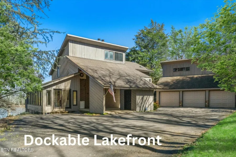 LEVEL, DOCKABLE LAKEFRONT RETREAT ON ALMOST 3 UNRESTRICTED ACRES. Welcome to your dream lakefront home, a stunning retreat nestled along 366' of the Tennessee River in Loudon. Offering the perfect blend of modern luxury, comfort, and natural beauty, this custom-built home boasts 5 bedrooms, 3 bathrooms, over 3,900 sq. ft. of living space, and breathtaking lake views from nearly every room. Step inside to an inviting great room with soaring vaulted ceilings, built-in bookshelves, and a striking stone wood-burning fireplace. Large windows flood the space with natural light, seamlessly connecting indoor and outdoor living. The newly renovated kitchen features sleek quartz countertops, stainless steel appliances, solid wood cabinetry, a breakfast bar, and a tile backsplash-perfect for both casual meals and entertaining. Adjacent to the kitchen, the enormous dining area offers deck access and a convenient serving window. The main-level bedroom is a private oasis with deck access and a spa-like ensuite bath. Upstairs, a double loft serves as two home offices, along with two additional bedrooms that share a full bath and a private balcony. The finished basement is a versatile space, featuring a second stone fireplace, wet bar, full bath, and a fourth bedroom-ideal for a mother-in-law suite or recreation room. Step outside to enjoy expansive outdoor living spaces. A sprawling deck offers the perfect setting for grilling, relaxing in the built-in hot tub, or taking in the panoramic lake views. The lower patio provides additional space for outdoor gatherings, just steps from the water. With a private boat dock and direct lake access, this property is a haven for boating, fishing, and waterside relaxation. Adding to the home's appeal is a detached three-car garage with a guest house above. Currently set up as a studio apartment with a kitchenette and full bath, this space is perfect for visitors, a private retreat, or even a rental opportunity. The guest house can also double as a theater room. since it has multiple speakers built into the walls. Located just downstream from Watts Bar, this home offers the perfect balance of privacy and convenience, with easy access to local dining, shopping, and amenities. Whether you're spending weekends on the lake, entertaining on the deck, or stargazing by the water, this is a rare opportunity to own a true lakefront paradise.