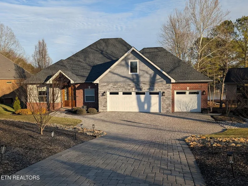 Custom-built lakefront home completed in 2023, ideally located in the prestigious Mialaquo Shores neighborhood of Tellico Village. Offering over 4,400 square feet of thoughtfully designed living space, this home showcases an open main-level floor plan with 10-foot ceilings and dramatic 12-foot tray ceilings in both the living room and primary suite. The main level features two bedrooms, two full baths, a dedicated office/den, and expansive kitchen, dining, and living areas perfect for everyday living and entertaining. The primary suite is a true retreat with breathtaking lake views, a spa-inspired bath, and a generous walk-in closet. Transom windows throughout the home flood the space with natural light. The lower level boasts 9-foot ceilings and includes two additional bedrooms, a full bath, a large family room, a convenient half kitchen, a wine room or flexible bonus space, and a finished workshop with garage door access ideal for hobbies or additional storage. Outdoor living is exceptional, featuring an expansive deck, a 1,000-square-foot paver patio with fire pit, and a covered dock equipped with power lifts for both a boat and jet ski. The durable brick, stone, and composite exterior is enhanced by Zip System sheathing, dual HVAC units, lake-fed irrigation, and economical utilities. A three-car garage and paver driveway complete this remarkable lakefront offering.