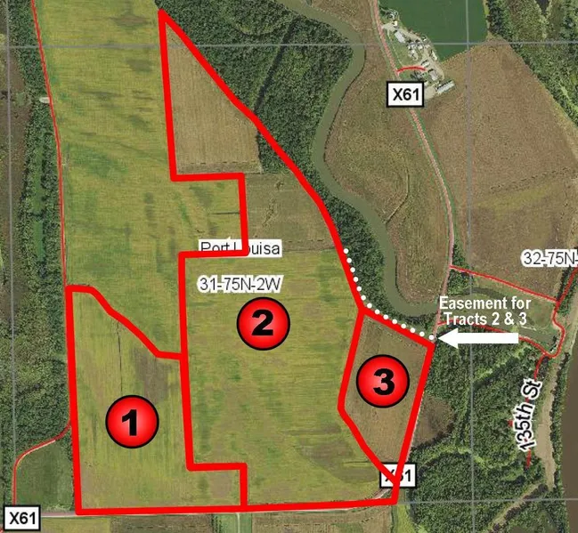 Land is located in Section 31 of Port Louisa N Township, Louisa Co., Iowa (31-75N-2W). From Wapello, IA take Hwy. 61 north approximately 3 miles to County Road G56, then east approximately 3 miles to County Road X61, then north approximately 2 miles.