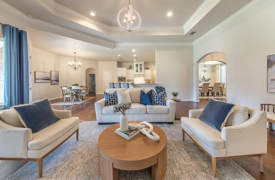 The isolated primary suite offers true retreat living with a two-step tray ceiling, luxurious bath with double vanities, soaking tub, walk-in shower, and large walk-in closet. You'll even find the added peace of mind of a built-in safe room.