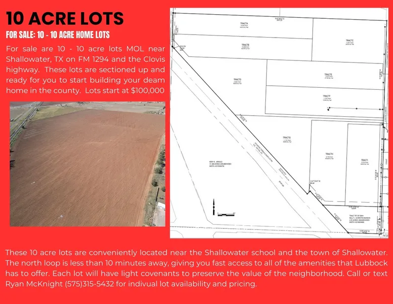 We are excited to present you an opportunity to have your own piece of the country. We have 10 10 acres+ lots for sale. Conveniently located just outside of Shallowater, TX these lots afford you the opportunity to be in the country and still be close to all that Lubbock has to provide. From these lots you are just a short commute away from the north loop around Lubbock which provides quick and easy access to any part of Lubbock. These lots are on the north edge of city limits of Shallowater on the corner of FM 1294 and the Clovis Highway (84). Light covenants just to preserve the integrity of the neighborhood and your investment. For availability call Ryan McKnight (575) 315-5432.