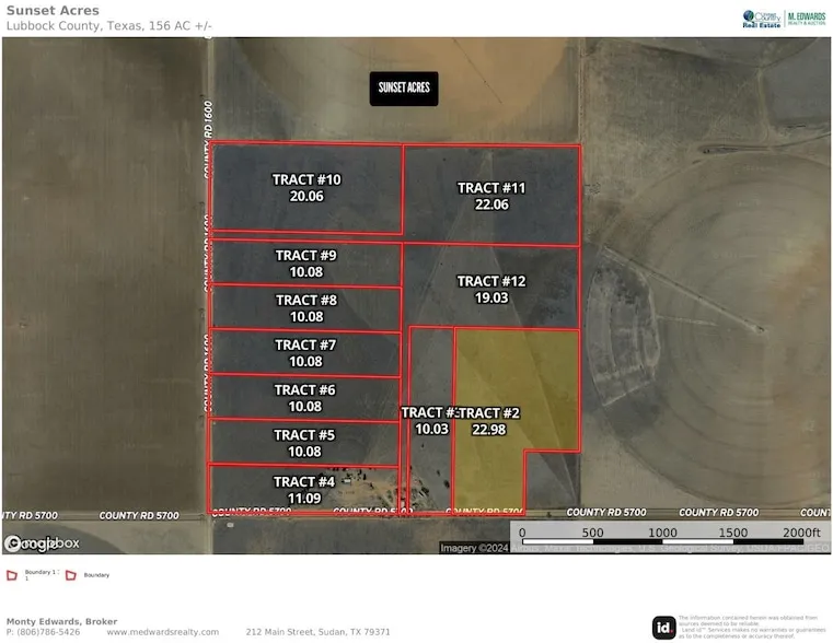 Individual tract description Tract 2 consists of 22.98 acres with CR 5700 access. Sunset Acres General Description Welcome to Sunset Acres in Shallowater, TX. Home of the most recent UIL State champion cheerleading team!National champion FFA team. Award winning ag mechanics, athletic department, and acedemics. Away from the major roads and towns, where you can enjoy the quietness with the sound of nature around you. Country property and still minutes from Lubbock amenities and entertainment. 11 tracts ranging in size from 10.08 acres to 22.98 acres. Electrical utility poles are present as well as access to fiber optics. Note: Tracts 2-3, 5-10, and 12 do not currently have water wells, there is no warranty expressed or implied on supply or access to water on any tract*