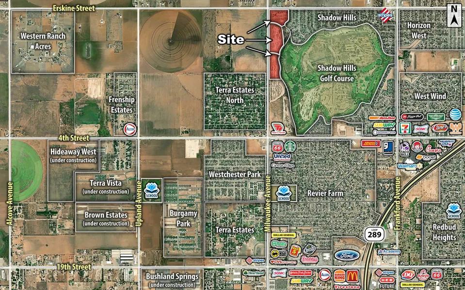 Large development tracts in developing northwest Lubbock with frontage on both major thoroughfares, Milwaukee Avenue and Erskine Street. Local business in the area include a Super-Walmart, Walgreens, CVS, Ford, Toyota, Kia, United Supermarkets, Applebee’s, McDonald’s, Covenant School of nursing and many more.