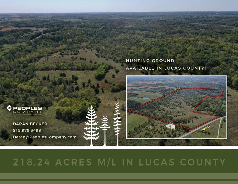 Peoples Company is pleased to offer 218.24 acres m/l of some of the best hunting ground in Lucas County and its on pavement. This property has it all, hardwood timber, ponds, tillable ground with plenty of locations for food plots. The farm is located just 5 miles North of Chariton, Iowa or 21 miles South of Knoxville, Iowa on Highway 14. If you are looking to build, the views are amazing and water and electric are at the road. A second road access to the Southeast corner of the property is on 510th Lane which allows for getting to your tree stand undetected. There are 100.24 acres of FSA tillable ground that was in CRP but has not been farmed since the contract expired and with a little work this could be brought back into production for added income. The fences are in good condition. Come take a look!