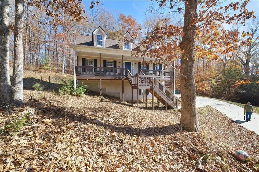 Very well-maintained cape cod with a full front porch in a private wooded setting. Excellent location just off 400 North highway at Whelchel Road. Easy travel to the Dawsonville Outlet Mall, the shops at Helen, public access to Chestatee River (kayaking, fishing), and an easy walk down to Lake Lanier. Will be convenient to new Lumpkin Hospital being built. First floor offers an open concept with a cozy fireplace, large kitchen (granite counters, stainless steel appliances, white cabinets), breakfast room, dining room, master bedroom, laundry, half bathroom, and door to the huge wood deck perfect for watching wildlife, entertaining, and grilling. Upstairs has 2 spacious bedrooms and a full bathroom. Finished basement level can also be a live-in suite ready for a kitchenette, with a full bathroom, bedroom, laundry, bonus room, private entry, and a family room. This beauty has beautiful har...