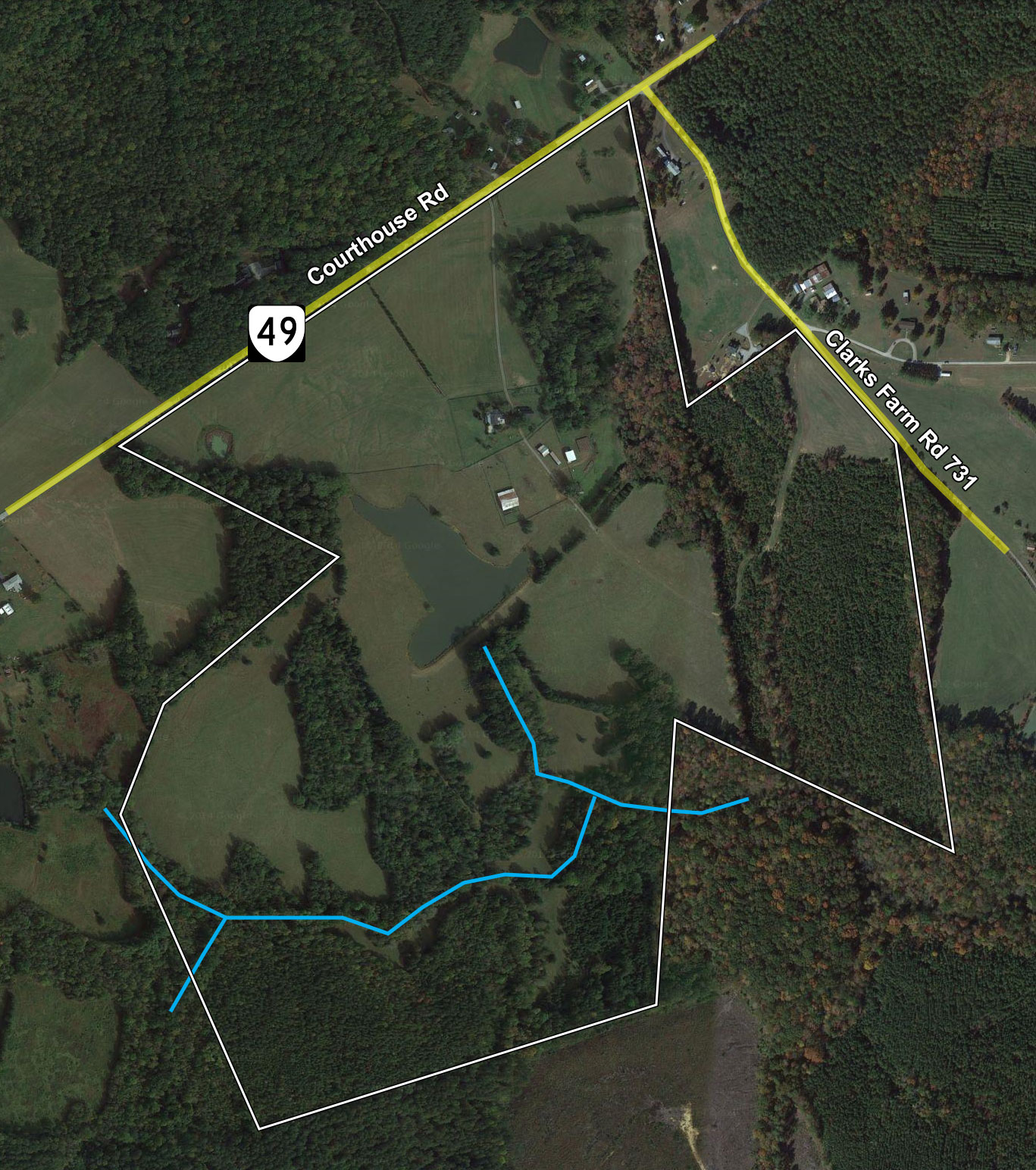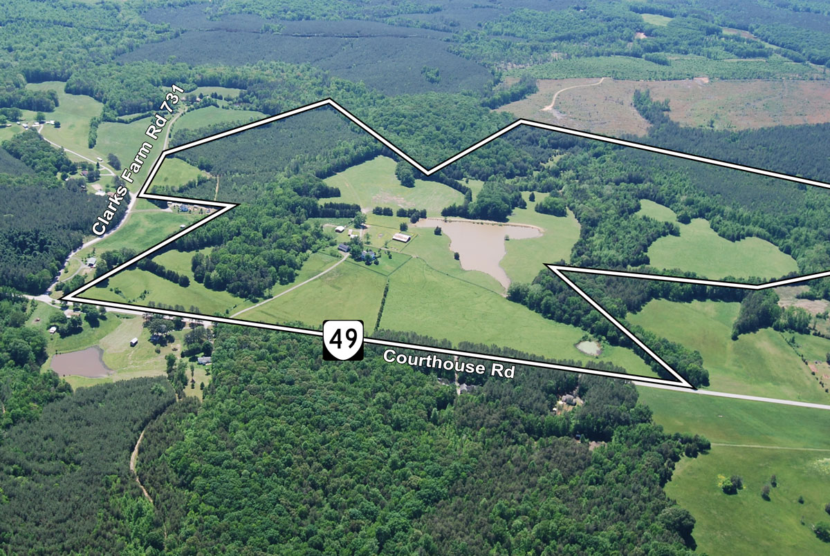 192 acres with long frontage on Rt.49 (Courthouse Rd) and additional frontage on Clarks Farm Rd (Rt.731).