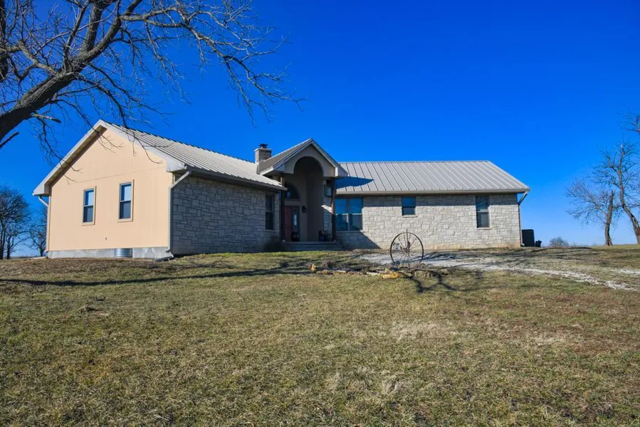 The build location for the home was perfectly planned out overlooking the land to take advantage of the endless views at every angle. The residence was built in 2012, offering 2,437 square foot of finished main level living with 4 bedrooms and 3 full bathrooms. Inside, you will be blown away by the home design and craftsmanship. In the great room, enjoy the beautiful brick wood burning fireplace that is the centerpiece, while enjoying the natural light and views from the almost floor to ceiling Anderson anti-UV windows. Rich solid oak hardwood floors run throughout the main living space with carpeted bedrooms and tiled bathroom floors. Solid oak trimmings and 6 panel solid oak doors through the entire home. Just off the great room and formal dining area to the east, 3 bedrooms and main full bathroom are located. The master bedroom complete with 2 double closets with custom built-in shelving and full master bathroom with separate soaking tub and shower. The custom kitchen boasts endless cabinetry, granite countertops, and an eat-in area that flows into the family room. A second brick wood burning fireplace is the statement piece here. An exterior backdoor leads out to the sprawling patio area with second entry from the laundry/mudroom. Down the hall, pantry space, storage closets, and linen closets all with built-in shelving line the way to the laundry/mudroom and 2nd en suite. Double closets and full bathroom complete out the main floor. The basement has been partially framed and is ready to be finished out. Egress windows in the bedroom spaces and stubbed plumbing for additional full bathroom have been set. Every inch has been placed perfectly throughout and well-built, which is why there is such a great flow and feel to the home, not to mention efficient. Exterior completed with native Limestone and lifetime galvanized metal roof. The 36' x 50' finished 3 car oversized garage has a workshop area and implement space.