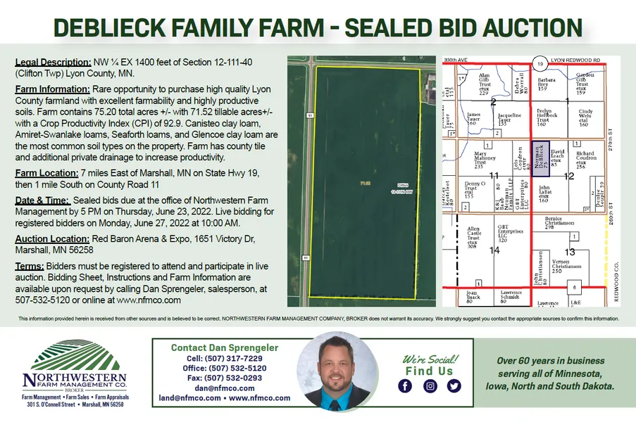 Farm Information: Rare opportunity to purchase high quality Lyon County farmland with excellent farmability and highly productive soils. Farm contains 75.20 total acres +/- with 71.52 tillable acres+/- with a Crop Productivity Index (CPI) of 92.9. Canisteo clay loam, Amiret-Swanlake loams, Seaforth loams, and Glencoe clay loam are the most common soil types on the property. Farm has county tile and additional private drainage to increase productivity.