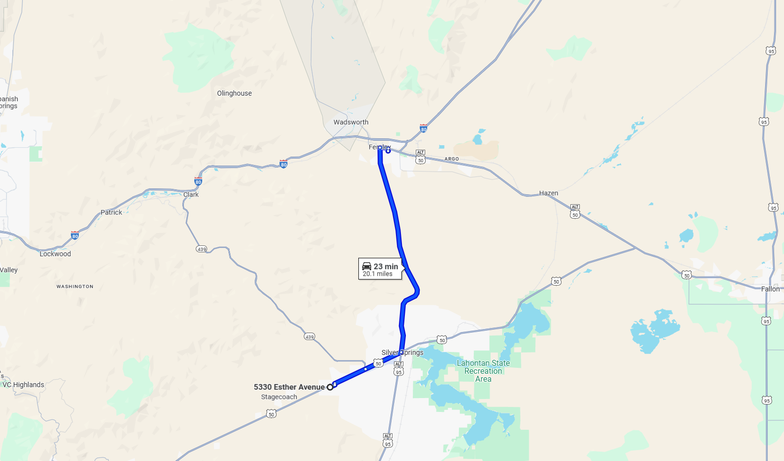 Closest Town/City: Fernley, NV 89408 - 22 mins (19.4 miles)
