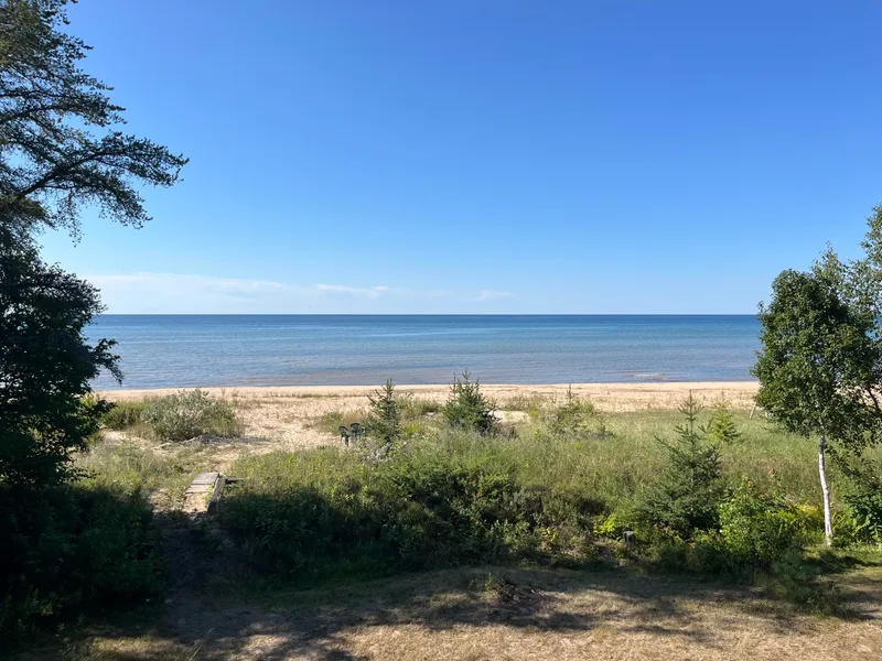 Enjoy spectacular views of Lake Michigan from two levels of outdoor deck, allowing access to 92 feet of private sugar sand beach. This home has lots of flexibility to accommodate large numbers of people. There are two large bedrooms and full bath on the main level, with an additional large loft and full bath upstairs. The current owners use the loft as the main bedroom, allowing lake breezes and the sound of lapping waves to waif in through the two sliding glass doors that lead to the upper deck. On those chillier UP evenings you can enjoy a beach campfire or build a fire in the fieldstone fireplace in the large living room. The large side yard allows for many outdoor games. The metal roof was newly installed in 2020 and septic has been maintained.This home is located in the Hiawatha Sportsman's Club, providing access to over 36,000 acres of property to enjoy, including stocked trout pon...