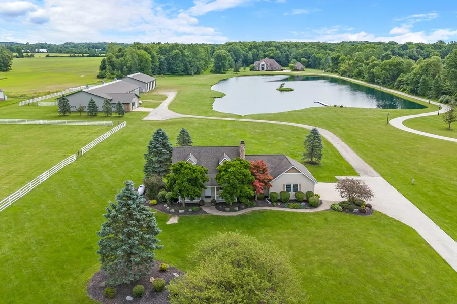 Equestrian Lovers' Dream! Experience superior attention to detail that any horse enthusiast will appreciate in this impeccably maintained and updated home. The home boasts a large island kitchen with granite countertops, built-in wine fridge, and stainless steel appliances. Enjoy a cozy family room featuring a two-sided natural fireplace and a private master suite with first-floor laundry. For the horses there is a perfectly built and maintained Morton barn with eight 12 x 12 matted stalls, each equipped with an automatic water system and private window. Includes a Pyranha Spray system, carpeted aisle, wash rack with hot/cold water, and tack room. Enjoy the large observation room overlooking the 60 x 120 arena with a built in watering system. It's also equipped with a half bath, laundry facilities, large hayloft with trap doors over each stall, and two paddocks with Centaur tensioned vinyl fencing. Additional features include a another Morton-built structure, 60 x 96, fully cemented with drains, electric, six 14’ overhead garage doors, and running water. Don't miss this incredible opportunity to own a meticulously designed and maintained piece of paradise, perfect for both you and your horses! Storage building can be leased to generate income. Equestrian Lovers' Dream! Experience superior attention to detail that any horse enthusiast will appreciate in this impeccably maintained and updated home. The home boasts a large island kitchen with granite countertops, built-in wine fridge, and stainless steel appliances. Enjoy a cozy family room featuring a two-sided natural fireplace and a private master suite with first-floor laundry. For the horses there is aPerfectly built and maintained Morton barn with eight 12 x 12 matted stalls, each equipped with an automatic water system and private window. Includes a Pyranha Spray system, carpeted aisle, wash rack with hot/cold water, and tack room. Enjoy the large observation room overlooking the 60 x 120 arena with a built in watering system. It's also equipped with a half bath, laundry facilities, large hayloft with trap doors over each stall, and two paddocks with Centaur tensioned vinyl fencing. Additional features include a another Morton-built structure, 60 x 96, fully cemented with drains, electric, six 14’ overhead garage doors, and running water. Don't miss this incredible opportunity to own a meticulously designed and maintained piece of paradise, perfect for both you and your horses! Storage building can be leased to generate income.