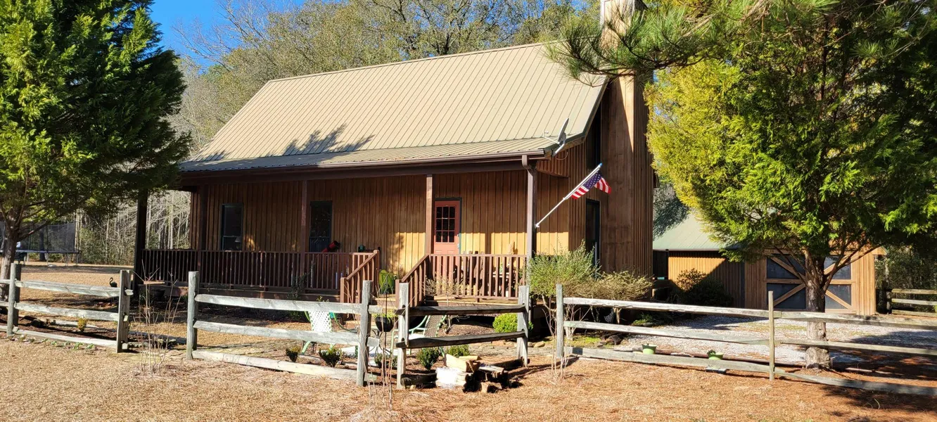 Structures: Has a nice cabin with 3 bedrooms and 2 baths. It has a large den with vaulted ceilings, kitchen and laundry room. - There is a garage area next to the cabin used as a work shop. There is also a 4-bay metal building with concrete slab used to house the tractor and equipment.