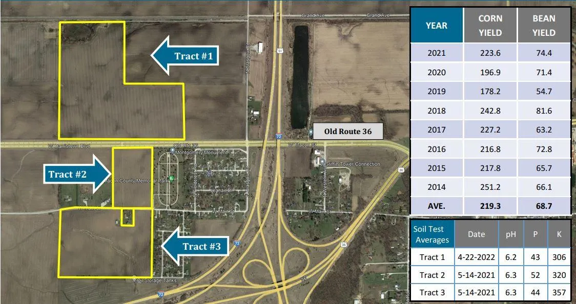 Tract #1 is 104.61 acres with 97.64 tillable acres and has a soil P.I. of 141.3. Soils include Drummer, Catlin, and Flanagan.