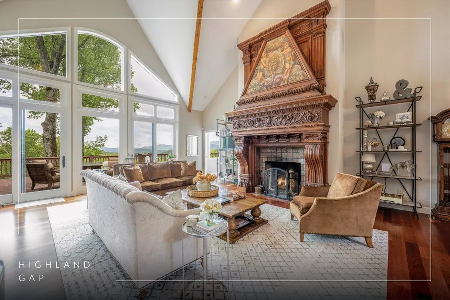 Accepting Back-Up Offers. Discover luxury & privacy in this one-of-a-kind estate perched on 7.63 acres within the exclusive Highland Gap community. This meticulously crafted home offers a true retreat, showcasing panoramic long-range views, blending exquisite design elements and worldly treasures. Antique German doors open into the great room featuring soaring vaulted ceilings with wood beams, a hand-carved Roman wood-burning fireplace and expansive windows framing breathtaking mountain vistas. Brazilian cherrywood floors lead to the gourmet chef's kitchen - thoughtfully designed with dual islands & professional-grade appliances including a Sub-Zero refrigerator, two dishwashers, side-by-side ovens, & a five-burner range with a griddle. One of the two dining spaces boasts a custom backlit Tiffany-style stained-glass ceiling, while the other dining area features a striking custom apothecary cabinet and the mountain view. The main level offers stunning views from every corner, including the primary suite, which features a generously sized ensuite bathroom, an expansive closet and direct access to the wraparound deck. Two additional bedrooms share a thoughtfully appointed bathroom, while a powder room and a large laundry room complete the level. Outdoor living shines with an expansive deck and a covered, screened-in porch with a cozy gas fireplace. The lower terrace level, perfect for entertaining or relaxation, features a locally handcrafted fireplace with a nature-inspired design, a 1,000-bottle wine cellar framed by intricate Indonesian temple doors, and a spacious living area with a gas fireplace. A wet bar with a wine fridge and ice maker adds ultimate convenience, while two additional bedrooms share a well-furnished bathroom. The outdoor space includes a fire pit area and stunning views. The detached garage apartment enhances the property with one bedroom, one bonus room, two bathrooms, a full kitchen and a private porch offering mountain vistas. Large windows welcome natural light throughout, & amenities include a gas fireplace, a private laundry room and modern finishes. Additional highlights of this estate include refinished wood floors, new carpet, fresh paint & updated siding on the guest house (all updates from 2022). A two-car carport with an EV charger, a 2.5-car garage & a partial generator provide practical conveniences. The Highland Gap community further enriches the experience with scenic waterfalls, walking trails & shared community events.