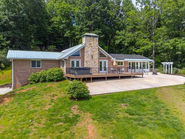Drive up to breathtaking mountain and valley views on this stunning 9.7-acre retreat! This beautifully landscaped property features stone retaining walls, a koi pond with extensive filtration system and koi farm hatchery, and an observation deck perfect for soaking in the scenery. Enjoy a large Trex deck with hot tub, plus a detached 2-car garage and 2-car garage in the basement. Inside, take in the views from all major rooms relax in the sun-drenched sunroom or gather in the vaulted living room with tongue & groove ceilings and a floor-to-ceiling rock fireplace. The kitchen impresses with granite countertops, abundant custom cabinetry, a gas range with electric oven, coffee bar, eat-in nook, and even more stunning views. A formal dining room and large pantry with main-level laundry hookups add convenience. The spacious master suite features dual vanities, tiled shower, granite counters, and walk-in closet. Two bedrooms share a Jack-and-Jill bath with separate sinks and toilets. Bonus room upstairs, finished bath in basement, solar panels, and generator wiring complete this incredible home.