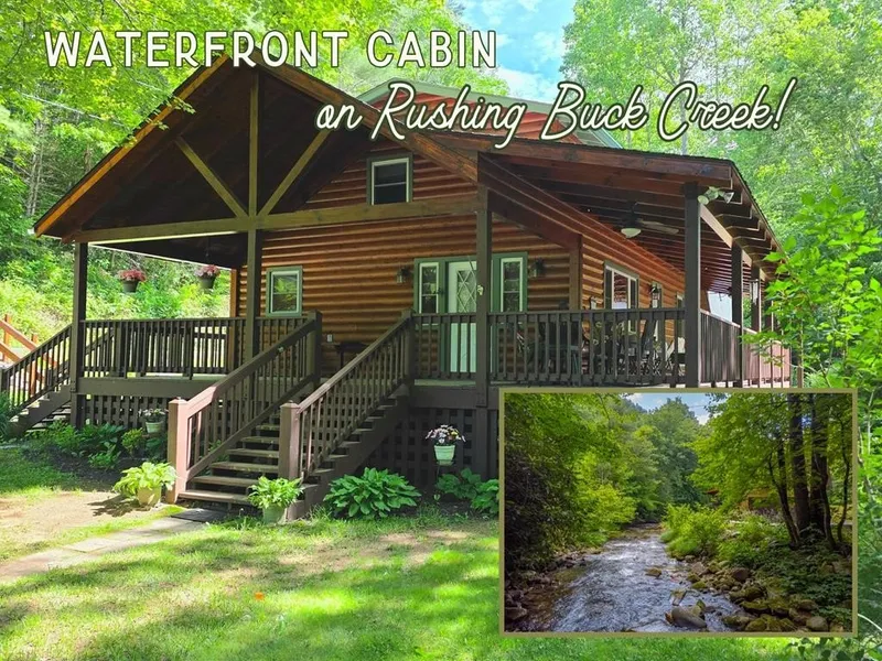 A remarkable creekfront getaway for the whole family! This park-like setting of 1.25 +/- acres features a 2BR 2BA log-sided cabin, a full 1 BR 1BA garage apartment AND includes an extra lot w/power box & septic installed. Step back to a simpler time & relax to the sounds of rushing Buck Creek right off the fantastic wraparound deck. Beautifully rustic & cozy interior w/knotty pine walls, beamed wood ceilings in the living & dining areas & a charming kitchen w/wood cabinetry & large island. A bonus room w/laundry can be used as an office or extra sleeping space & a full bath are all on the main level. Upstairs are two bedrooms and a full bath. The detached, oversized 2 car garage has plenty of space and above, the separate apartment features a bedroom w/wood paneling, a large full bath, eat-in kitchen & a cozy living area. There's even a balcony to enjoy the sounds of Buck Creek. Conveni...
