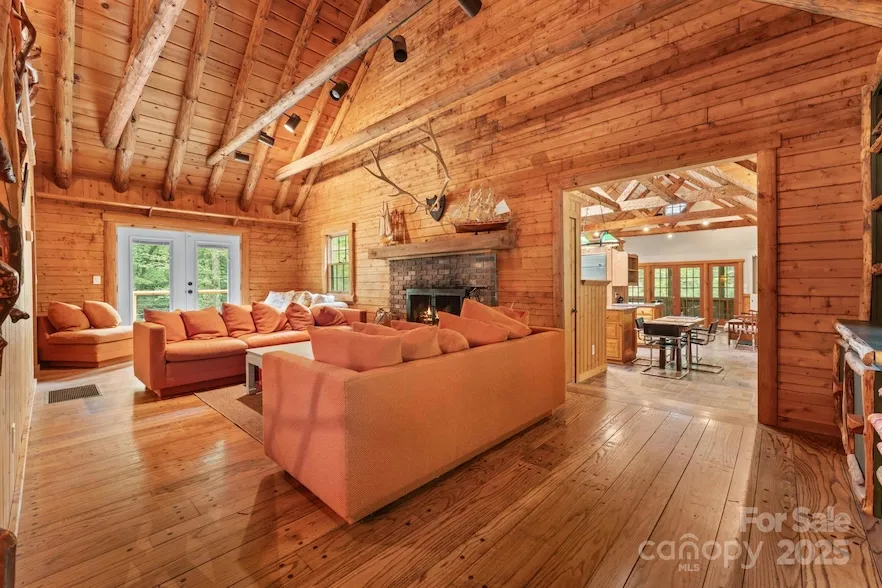 Rustic charm meets endless potential in this 3BD/3BA mountain cabin on 2.69 private acres, just 10 minutes from downtown Highlands. Vaulted ceilings and exposed wood beams highlight the spacious kitchen, dining, and living areas, creating a warm lodge-style atmosphere. The chef s kitchen boasts a large commercial-grade gas stove, brick flooring, island with sink, and rustic Italian-inspired design. Natural light floods the space through oversized windows and a skylight, while the dining room features lighted built-in cabinets perfect for entertaining. Relax by the woodburning fireplace in the living room, or enjoy the screened porch overlooking your wooded retreat. Outdoors, a small creek with waterfalls adds to the peaceful setting, and the recently replaced back deck provides the perfect gathering spot. The large finished basement with full bath offers additional living or recreation space. With main-level living, country privacy, and town convenience, this cabin needs a little TLC but offers incredible opportunity to create your dream mountain getaway. Located just around the corner from Blue Valley in Nantahala National Forest where you can enjoy bike riding, hunting & fishing, hiking to Picklesiemer Rock House and other trails. Enjoy nearby downtown Highlands NC for upscale boutique shopping, fine dining, outdoor music venues, art galleries and more.