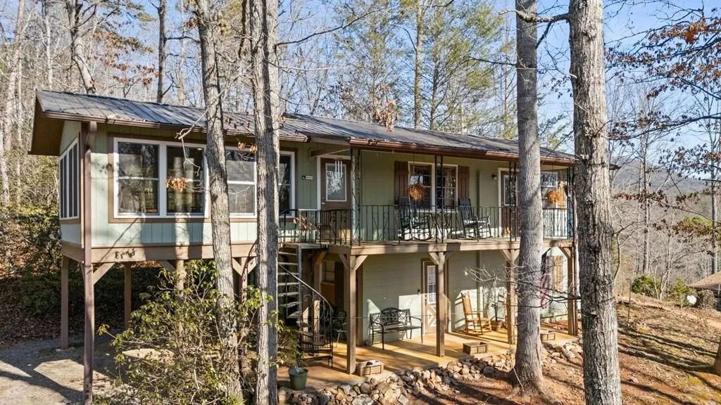 Sweet Franklin NC mountain cabin just moments from the center of town. This 2 bedroom, 2 bath home is tucked away in a quiet setting surrounded by mature trees, and perennials. It has a nice winter view and an easy access LEVEL drive and yard! Plenty of parking for you and your guests. The home has 2 spacious decks, 1 upper & 1 lower. There is a lower level that has a good size family room, a mini-kitchen, full bath, laundry facility and a large workshop. This lower level is accessible from both inside and outside of the home. The main level has a stunning custom Sun Room with windows all around, heated. The main level has 2 bedrooms and 1 bath, a real cute kitchen with a breakfast bar and electric appliances. Lower level heat is electric, upper level is a Mini-Split and baseboard. new metal roof 2025!
