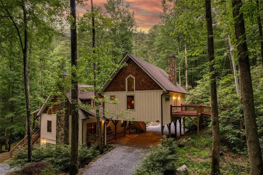 Seven minutes from downtown Highlands, this bespoke mountain lodge is the ultimate naturalist's retreat. On nearly two acres of impeccably landscaped, unrestricted terrain abutting federal forest land, this residence boasts a stream and waterfall, hiking trails with mountain views, and a trout-stocked pond - an angler's paradise. Included with the residence are professionally curated high-end furnishings and fixtures. The adjacent outdoor living deck, equipped with a porch enclosure system, offers a year-round alfresco dining experience. The primary suite is a sanctuary, with a sumptuous soaking tub, a spacious walk-in shower, and dual sinks. On the upper level, guests can unwind in the loft or retire to one of two generously proportioned guest rooms. Descend to the club level, which includes ample storage, a laundry room, a full bath, and a game and family room that seamlessly transitio...