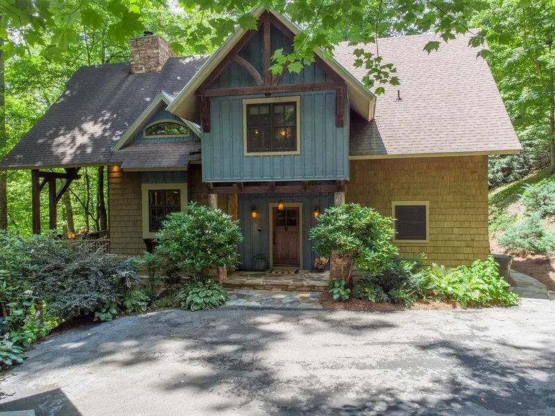Gorgeous furnished, custom Timber Frame cabin nestled in the mountains of North Carolina. 2.5 private acres in gated Featherstone community near Highlands and Franklin, NC. Enjoy the soothing sounds of the small creek from your large timber frame porch with stacked rock wood burning fireplace. Outdoor lighting and ceiling fans allows for entertaining both indoors as well as out. Interior features impressive Timber Frame construction including tongue and groove cathedral ceilings, open floor plan, floor-to-ceiling stacked rock wood burning fireplace, custom cabinetry, granite counters, dual fuel range, Hickory floors, JELD-WEN windows, high-end appliances, and beverage/wine cooler. Master Bedroom on the main for plenty of privacy and features a master bath with a double copper sink vanity, walk-in slate shower, built-in dresser and closet cabinetry. Two upper-level guest rooms with en-sui...