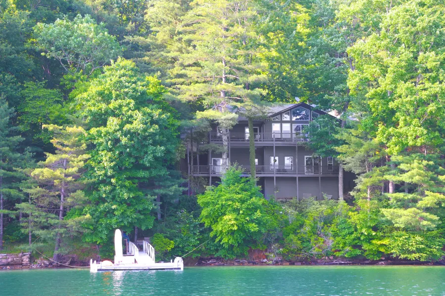 Nantahala Lake Front luxury home in a gated community. This exquisite contemporary home comes furnished and boasts 3000+/- sq.ft. of luxurious living with a long-range view of Lake Nantahala with its pristine and protected mountains.Southern exposure ensures year-round sunshine through multiple glass doors that access extensive outdoor living areas, including double porches, a useable beach area when the water recedes and large boat dock.The open living concept is accentuated by a vaulted ceiling, stone wood-burning fireplace, new tile, hardwood, carpet, LVP throughoutnewer Quartz countertops, backsplash and appliances.The lower-level family room and wet- bar area ensure a comfortable space for watching TV, playing games, and relaxing.Additional bunks and a full bed and bath are open to the downstairs porch overlooking the lake.The 3-car garage can be used as an additional recreation are...