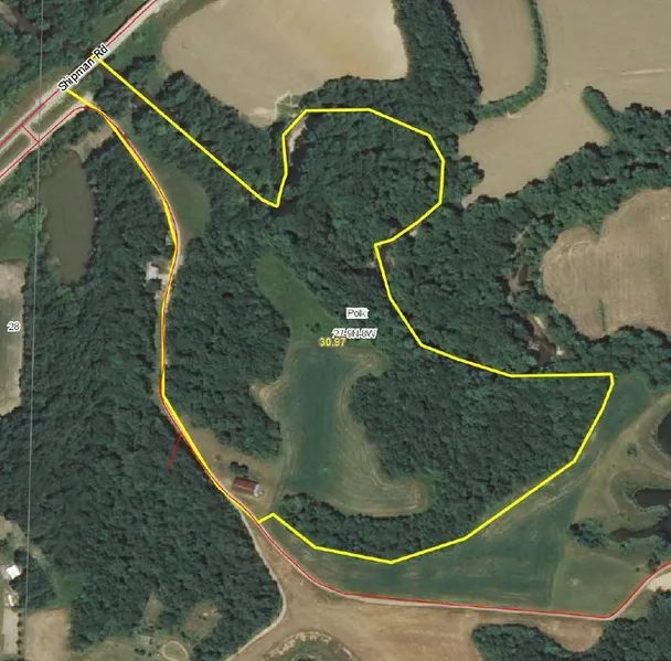 This property is surrounded by and just across the creek from rich farm ground creating a mecca for trophy whitetail deer and turkey. The approximately mile of creek frontage is a heavy used corridor for deer, including those that move in and out of the park. A mix of hardwoods, rolling hills and 7 acres of open fields provide a hill top home site with nice views and two potential lake sites. Rural and well water, electric and propane are already at the site. There is a 45 x 75 pole barn with an insulated and propane heated 10 x 37 bunk room.