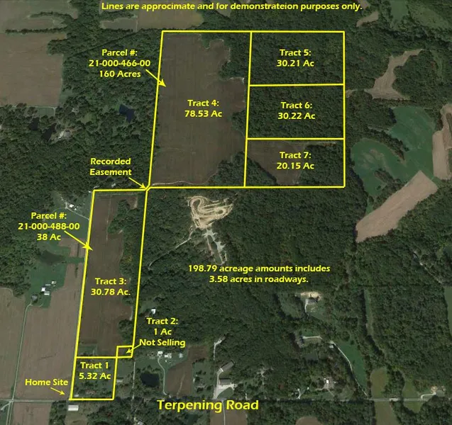 These recently surveyed 198.79 acres offer a great mixture of tillable acreage and woods in addition to a small single family home and an outbuilding. There is approximately 101 tillable acres and the remaining 97.79 acres are woods. The land is divided among 2 parcels, (1) 30.78 Acre parcel that has a home site, electric, well, & septic system, & propane and (1) 160 acre parcel. The 3 BR / 1BA, 900 SF home will need some updating and repairs. The home offers a full unfinished basement. Buyer would need to verify condition of all utilities. There is city water available for the front 30.78 acres. The outbuilding on the property has had multiple uses over the years.