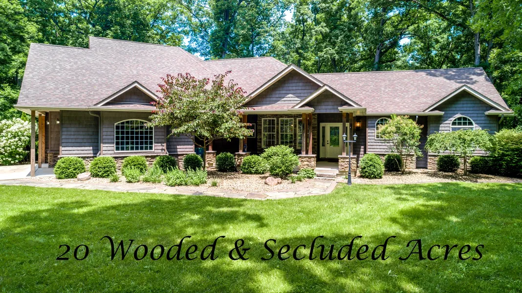 KEEP SHOWING!!! This custom ranch 3 BR, 3.5 BA home is nestled on 20 private, wooded acres abundant with wildlife. When you walk in the front door, you will know this home has been well maintained. With a phenomenal floor plan and high-end finishes, open living with a large kitchen, formal dining, breakfast room, laundry off the kitchen, den/library with wood burning fireplace and more on this split bedroom main level, you will surely love it. Master suite with sitting room, bath with separate vanities, walk-in shower, whirlpool tub and 8 X 19 walk-in closet. The additional two bedrooms share a Jack and Jill bathroom. The lower level has a large family/media room with projector/screen. An outdoor screen-in kitchen comes fully equipped with gas grill, small refrigerator, sink, etc. 35 X 45 pole barn with bathroom and workshop. Energy efficient Geothermal heating/cooling system. HVAC, cent...