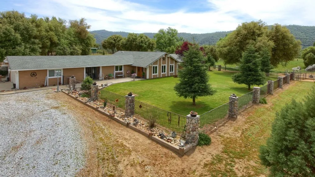 Very private whether you are in the front, back or side yards you will enjoy the fact that neighbors are not watching you. 9+/- almost flat acres for horses, cows, goats and more. All fenced and cross-fenced into 4 fields separately fenced. Round pen, stables with water and power. The home is remodeled with wood grain tile plank floors, granite counter tops and a very large open family room. Large bonus room could be used as TV room, trophy room or office. Outdoor patios, spa and all landscaped. Just gorgeous! Lots of carports and outbuildings.