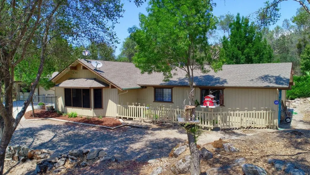 Golfer's dream come true! This home is located between the 8th and 9th holes along the exciting 9 hole executive course located at the Yosemite Lakes Park Golf Course facility in Coarsegold, CA. The home offers an open floor plan that includes 3 bedrooms, 2 bathrooms on 1.11+/- acres. Large beams accent the vaulted ceiling in the great room accompanied by a wood burning fireplace. The kitchen has a large pantry, electric range, a breakfast bar that opens to the dining area and a window sink that looks out to the beautiful covered patio. The master bedroom highlights walk-in closets, double sinks and a sliding door to access the patio. Step outside and enjoy the natural rock waterfall that empties into the 4' deep Koi pond and is surrounded by a raised deck and shade trees or relax in the spa. The home includes an attached 2 car garage and a large workshop that can accommodate 17' fishing boat or any other toys. Even a place to park your golf cart and mower. A detached outbuilding holds golf equipment, hobbies, or crafts - you name it! An area accessed from the driveway has an oversized RV parking area with hook up. The exterior of this home was painted in 2018 and a new 30-year roof was installed in 2017.