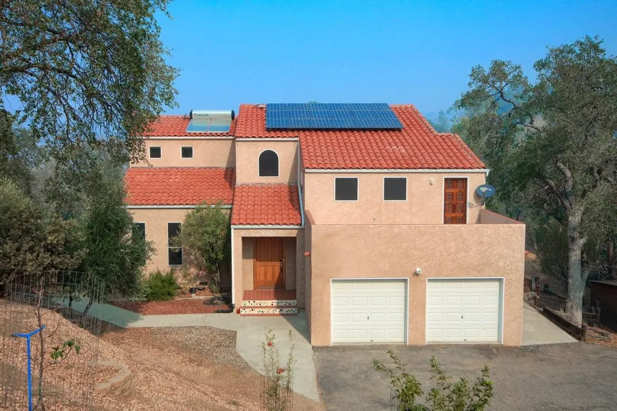Custom built home with WOW! This 4 bedroom, 3 bath adobe style home offers details galore! Set on beautiful 4.16+/- acres, you can enjoy the views from the ground level patio or the lovely roof top patio! Crafted with 2x6 construction, stucco exterior with tile details at the entry, tile roof and beautiful tile floors. Money saving in electric costs with solar screens on 2 sides, Solahart water heater, Airscape whole house fan and owned 3 KW solar! Large living room has lots of windows to take in the views, high ceilings and free standing stove. The kitchen and informal dining area offers tiled center island with built-in propane cook top, built-in window bench seating for the dining area and walk-in pantry. There are 2 separate master suites - one on each floor. Large utility room with sink. Each bathroom has beautiful tile work with custom details. Lots storage throughout. But wait! The upstairs also has a fantastic office/study space with access to the roof top sun deck/patio! This gentle and rolling property would be great for your horses with a pen, cover, feeder and automatic water set-up with plenty of room for them to roam. This wonderful well maintained home has so many features, you must see them all for yourself! Located in Yosemite Lakes Park you also have the community golf course, swimming pool, tennis, ponds, clubhouse, equestrian center and restaurants!
