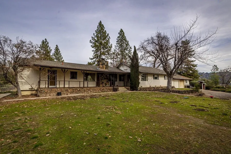 This home does offer basically 2 master bedrooms, one at each end of the home. This home has potential. With some updating, you will enjoy the view from the front porch, relaxing in the living room with rock fireplace with insert and it has a kitchen with convenient laundry room. Very well built with a 13+/- year new roof. Once entering the paved driveway through the gate, you have an option to drive around to the back of the house and drive into your garage. That's right, it's a drive through garage. This way, you can just take off with no backing up to do and this attached 2 bay garage is oversized with a full bay set up for a large workshop. Or you can turn to the right of the home and head on over to your steel constructed oversized garage with a separate storage area and another area with a bathroom set up, but not fully connected to all the plumbing. Extra outbuildings for a tractor or wood storage and another work/storage shed with power. Due to the interior fencing, you can have a great garden and tend to your fruit trees and grapes without the wildlife eating your garden. The land is very gentle and pretty much cleared of the brush. Would make a great retreat, RV storage, camping and just a nice family home or get away from the city.