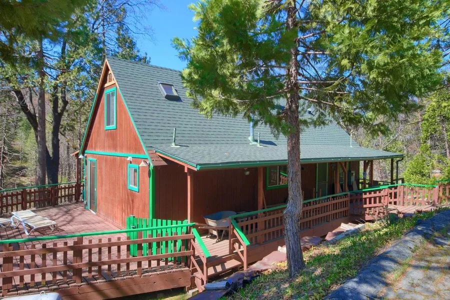 This charming 2 bedroom cabin is situated on the lovely area of Cascadel Woods. The front of the home faces the tree lined front yard and the rear overlooks a seasonal stream and the rustic 40 acre common area. Redwood decking encompasses 3 sides of the home. Both the front and back decks connect to a large family-sized deck on the side. Making this an great place to entertain! The living room is adjacent to the dining room and well-equipped kitchen with a Sears side-by-side refrigerator, electric range/oven, microwave, dishwasher and garbage disposal. An EPA certified wood burning fireplace is the heart of the main floor and the gas wall heater can handle seasonal chill. The master bedroom is complete with a ceiling fan, king sized bed, closet and a dresser. The upstairs bedroom has a sloped ceiling, ceiling fan, private washroom and queen sized bed. There is a full bathroom that features a linen closet, full bath and shower, exhaust fan/heater and on-demand hot water. From the back porch downstairs you will find a 2 room utility area designed for the washer and dryer, storage space and even space for a possible workshop. The home has 2 solar tubes to bring light in the living room and a skylight in the upstairs bedroom. The roof was completely replaced in 2006. Fenced-in back yard for your pet.