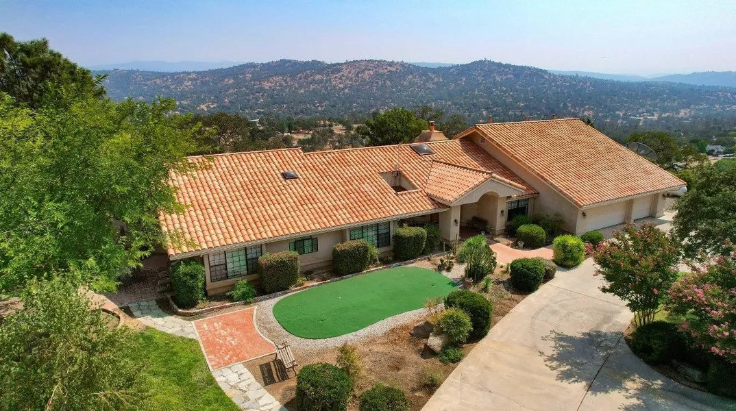 Custom built beauty w/so many extras! 4 BD, 2 1/2 BA home sits grandly on 8.39+/- lovely gated acres designed to take in the gorgeous views! Let this home welcome you w/a breathtaking front porch w/a private putting green. You will find a marble entry leading to the living room w/fireplace & open dining room. There is a wonderful family room w/a fireplace & special bonus sitting area w/a wet bar. The kitchen offers a great center island w/vegetable sink, built-in stove top & ovens, trash compactor, dishwasher & built-in refrigerator w/a nice breakfast nook. 2 guest BDs w/a jack 'n jill BA, laundry room w/built-in cabinets, a lg. office w/built-in shelves, a half BA & the master retreat w/private patio entrance & a jetted tub & shower. There is a wine cellar ready for your next dinner party. The back patio is truly lovely w/brink & stone inlaid concrete accenting the Spanish tile roof & a pergola to sit & enjoy the mountain views & sunsets! There is a greenhouse for the gardener & a side yard w/fruit trees & room to grow your favorite vegetables! The circular drive leads to the home, an attached 3 car garage & a detached 1 car garage w/a carport w/owned solar panels & a workshop w/half BA. 2 air conditioning units, quality 2x6 construction & beautiful accents & details. Gorgeous 8+ acres to bring your horses! But if you would rather Yosemite Lakes Park offers great amenities including an equestrian center, golf course, pool, tennis, clubhouse & more! This is a rare find!