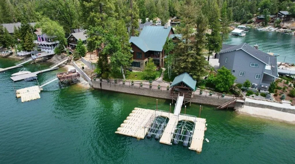 Amazing Lake Front Home w/private boat dock! 142 ft. of lake frontage & unobstructed breathtaking views to enjoy from the decks & patios! The private dock has 2 boat lifts, room for 7 jet skis & ramps! You'll know there's something special about this 4 BD, 3 1/2 BA home from the time you pull in! The details throughout are gorgeous w/dbl. door entry to the grand rock fireplace & built-in entertainment center in the living room, an office w/built-in bookcases & the family/dining room w/lake views! Lg. kitchen w/breakfast bar & center island has a fabulous Butler's pantry w/another center island & wine refrigerator! The BDs are comfortable & have some lake views. The master BD is a true surprise! The huge floor plan for this BD offers a sitting area w/french doors to a private deck, walk-in closet & lg. private BA w/dual vanities & soaking tub, separate walk-in shower & built-in cabinets. The stunning home has been well maintained & updated w/recessed lighting, ceiling fans, hardwood & slate floors & Pella windows. But the best is yet to come! Step out on the expansive decking to find beauty everywhere you look! Crystal clear lake views, mountain peaks, Pines, inviting landscaping, rock accents everywhere & a pergola covered lower deck along the water's edge for you to enjoy. 2 car garage, metal roof, completely fenced in wrought iron, lovely light fixtures & a private BBQ area. Ideal for a vacation rental & Yosemite is just 30 minutes from this extraordinary lake front home!