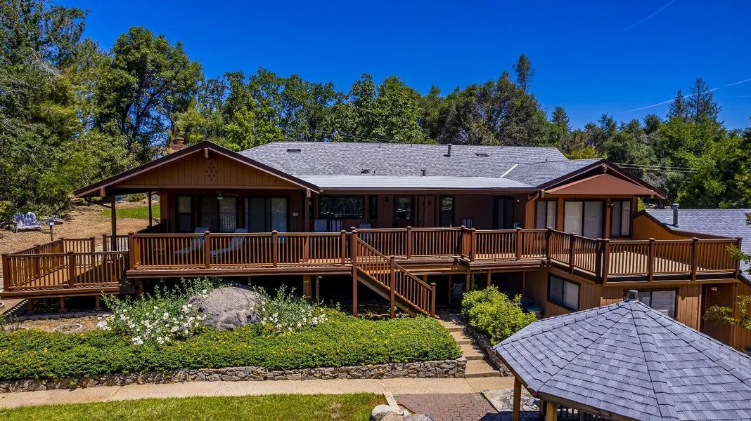 What a great opportunity to live in the mountains so close to Yosemite with such a unique style home and setting! With all the wood features from the Knotty Pine beam ceilings to the Oak wood trim throughout the home and the Marble floors upon entry that flow into the dining area and kitchen you'll find this home a beautiful retreat! The oversized fireplace area and hearth with woodstove and surrounding bookcases and display cases are just so inviting to sit back and relax in front of your woodstove. Be sure to look up for oversized skylights with blinds to take advantage of that natural sunlight. From the dining room, meander out onto your large, covered patio and take in the breezes while looking out over your 2.8+ acres of gorgeous property and the stunning distant mountain views. So much room for entertaining with multiple decks, patios, and large gazebo area. The oversized master bedroom and bathroom have direct access to your deck as well. Game room, hobby room downstairs with bath for extra space and/or activities. Be sure to check out the RV barn that is accessed from the other side of the property with full drive through and paved driveway with power. The home has a whole house generator for added convenience!