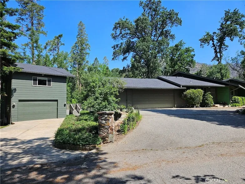 DREAM PROPERTY with stunning designed interiors, decks, screened-in porches and +-300 ft of gorgeous year-round creek frontage! There's a single story 2,479 sq ft 3 Br/2 Ba home and an adjacent 2 story tower w/a 1 BR, 1 BA, walk-in closet & living room upstairs comprising an additional ~600 sq ft of living space. Downstairs is a large ~600 sq ft art studio w/sink, workbench & private deck set in quiet beauty. The 1.49 ac property includes a gazebo nestled on the creek. All buildings overlook lawns & fruit trees. The main house s large light-filled first floor master suite includes walk-in closet, built-in bookshelves & a stone-tiled double shower; as well as cherrywood cabinets, casework & maple floors, w/custom & gallery lighting throughout, and warmed tile bathroom floors. The chef s kitchen has granite counters, a Miele refrigerator & freezer, built-in espresso maker, a gas stove & 2 ovens. The laundry/mud room leads to a bright 2+ car garage w/Tesla charger. The central heat, AC, refrigerator & select outlets in the main home are backed up by an emergency generator. You'll love the screened in back porch (not included in sq footage), and there is an attached mower shed. The tower has heating & AC upstairs & down, and an RV sized garage door. Expansive grounds include a screened raised bed vegetable building, cross-fenced yards, stone planting terraces, and apple, pear & redwood trees, as well as custom-built stone walls. The neighborhood, Cascadel Woods, is located on a ridge surrounded by the Sierra National Forest, just off the Sierra Vista Scenic Byway, and is close to Bass Lake, and less than 45 minutes to Yosemite NP. Cooler in summer, this elev. often gets snow in winter. This property is shown strictly by appointment only to qualified buyers.